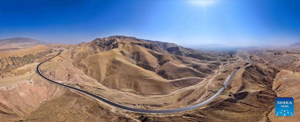 An aerial drone photo shows part of the first-phase section of the China-Tajikistan Highway near Kalai Khumb, Tajikistan, on Sept. 10, 2025. The China-Tajikistan Highway -- also known as the Pamir Highway -- was first built in the 1940s. Stretching more than 1,000 km from Dushanbe to Karasu on the China-Tajikistan border, it is vital for Tajikistan's transport and external links.