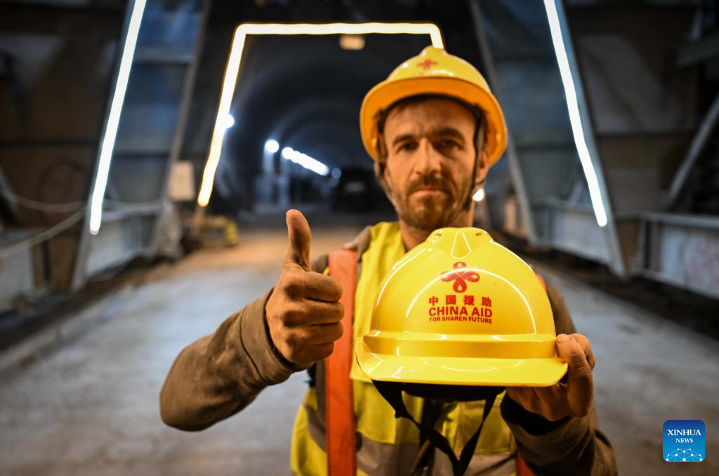 A Tajik worker poses for photos with a helmet at the construction site of the second-phase section of the China-Tajikistan Highway near Kalai Khumb, Tajikistan, on Sept. 11, 2025. The China-Tajikistan Highway -- also known as the Pamir Highway -- was first built in the 1940s. Stretching more than 1,000 km from Dushanbe to Karasu on the China-Tajikistan border, it is vital for Tajikistan's transport and external links.