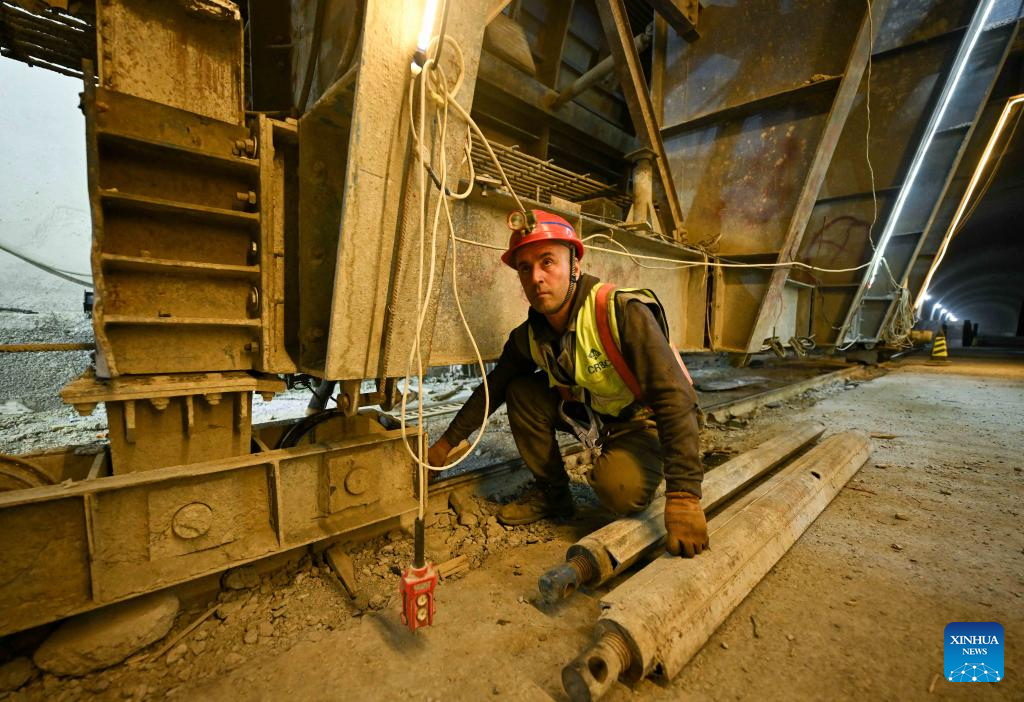 A worker operates at the construction site of the second-phase section of the China-Tajikistan Highway near Kalai Khumb, Tajikistan, on Sept. 11, 2025. The China-Tajikistan Highway -- also known as the Pamir Highway -- was first built in the 1940s. Stretching more than 1,000 km from Dushanbe to Karasu on the China-Tajikistan border, it is vital for Tajikistan's transport and external links.
