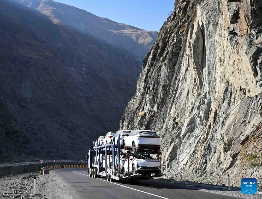 A vehicle carrying Chinese-brand automobiles travels on the second-phase section of the China-Tajikistan Highway near Kalai Khumb, Tajikistan, on Sept. 11, 2025. The China-Tajikistan Highway -- also known as the Pamir Highway -- was first built in the 1940s. Stretching more than 1,000 km from Dushanbe to Karasu on the China-Tajikistan border, it is vital for Tajikistan's transport and external links.(Xinhua/Li Renzi)