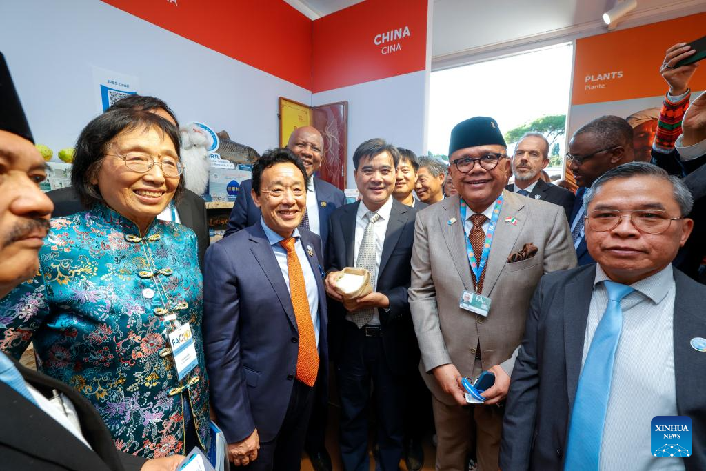 Director-General of the Food and Agriculture Organization of the United Nations (FAO) Qu Dongyu (2nd L) visits the FAO global exhibition titled "From Seeds to Foods" in Rome, Italy, Oct. 10, 2025. FAO opened a global exhibition titled "From Seeds to Foods" in Rome on Friday, celebrating eight decades of international cooperation in fighting hunger and transforming agrifood systems. (FAO/Handout via Xinhua)