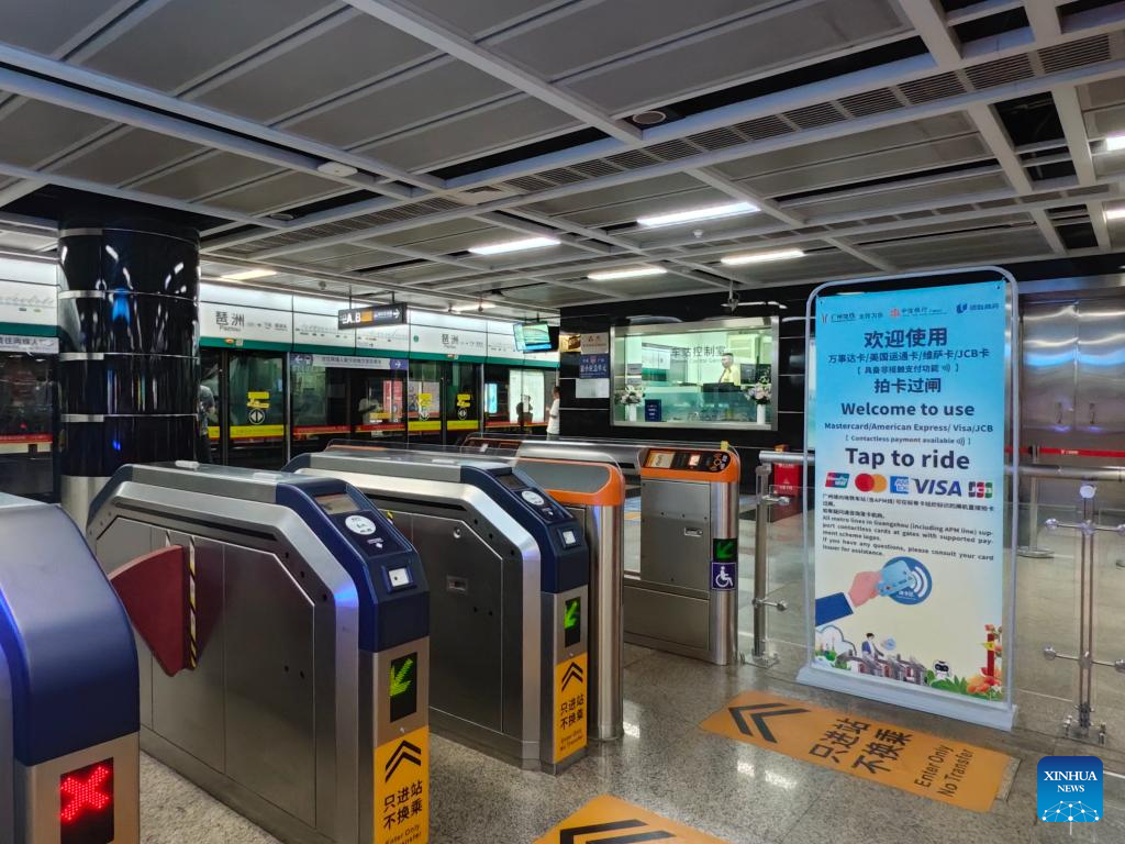 This photo taken on Oct. 11, 2025 shows a banner promoting contactless payments with major international bank cards beside fare gates at a metro station in Guangzhou, south China's Guangdong Province.(Guangzhou Metro/Handout via Xinhua)