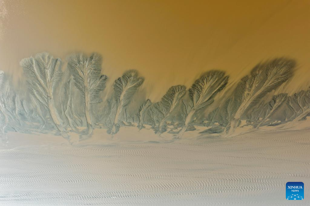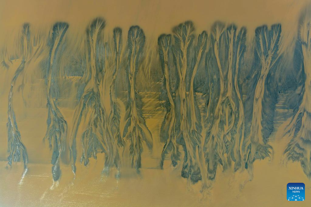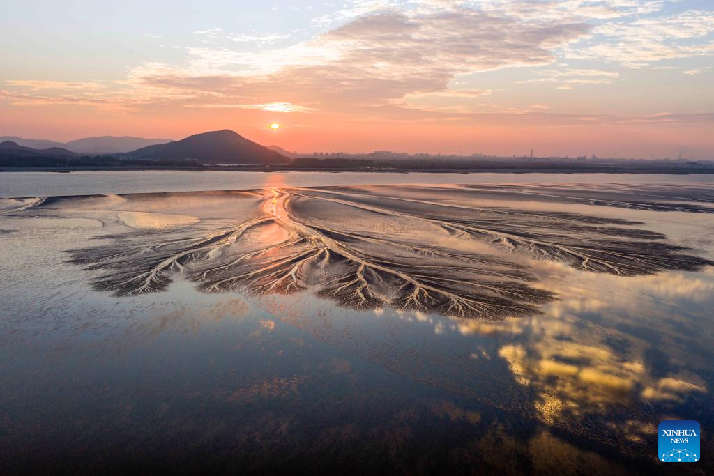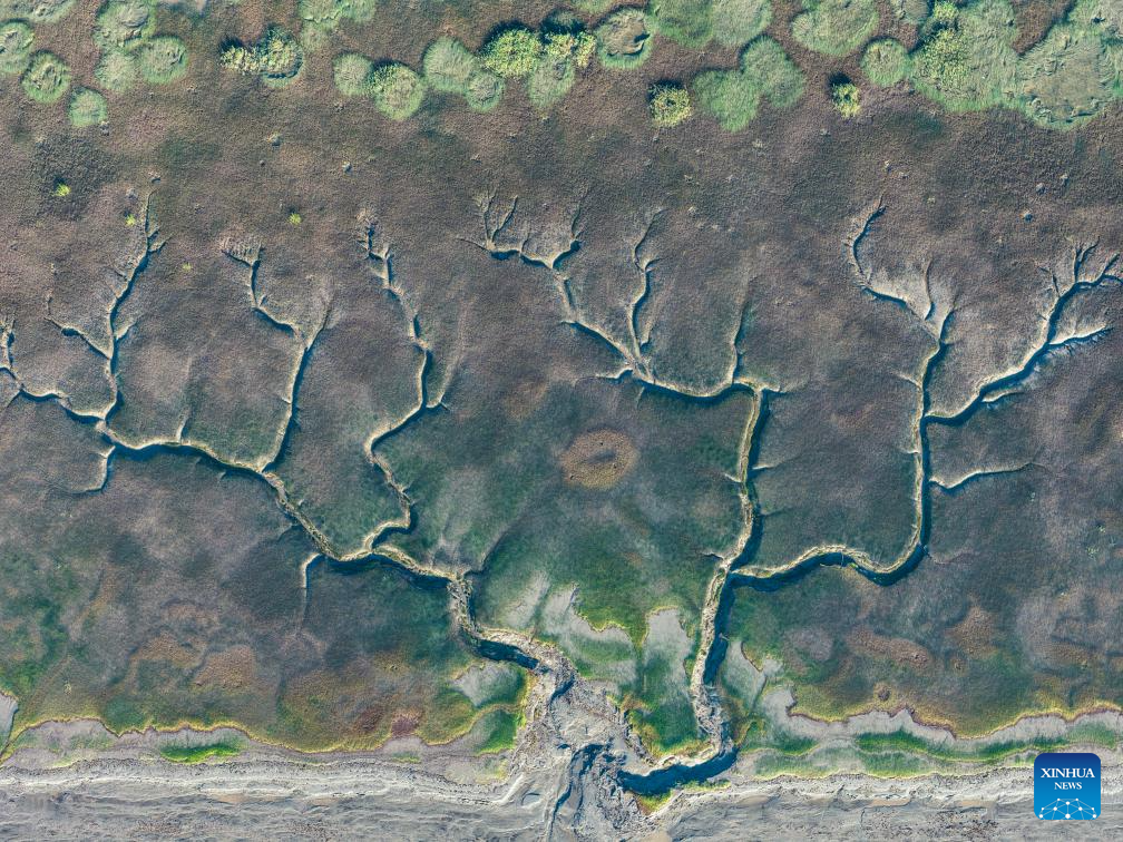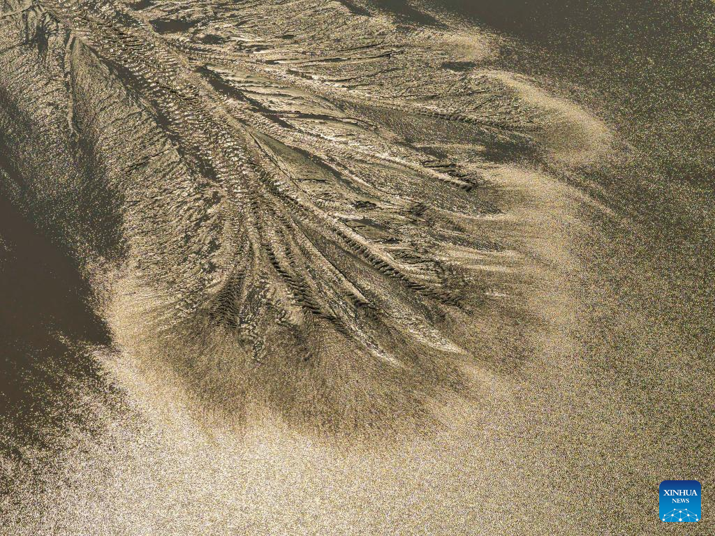 An aerial drone photo taken on Oct. 11, 2025 shows a view of the tidal flat after the tidal bore of Qiantang River receded, in Haining City, east China's Zhejiang Province. The Qiantang River tidal bore, famous for its height and speed, is a traditional tourist attraction in Zhejiang Province. Every year, soaring waves crash along the banks of the river, near the city of Haining. After the ebb of the tide, different tree-shaped patterns appear on the tidal flat. (Xinhua/Xu Yu)
