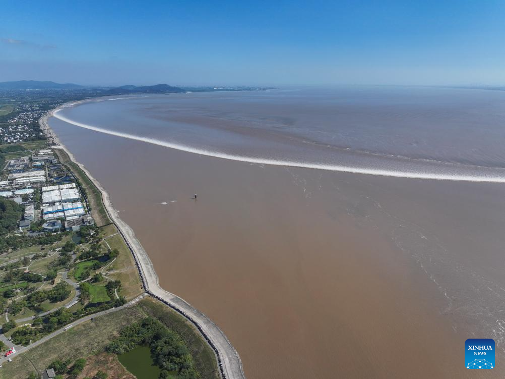 An aerial drone photo taken on Oct. 10, 2025 shows a view of the tidal bore of the Qiantang River in Haining City, east China's Zhejiang Province. The Qiantang River tidal bore, famous for its height and speed, is a traditional tourist attraction in Zhejiang Province. Every year, soaring waves crash along the banks of the river, near the city of Haining. After the ebb of the tide, different tree-shaped patterns appear on the tidal flat. (Xinhua/Xu Yu)