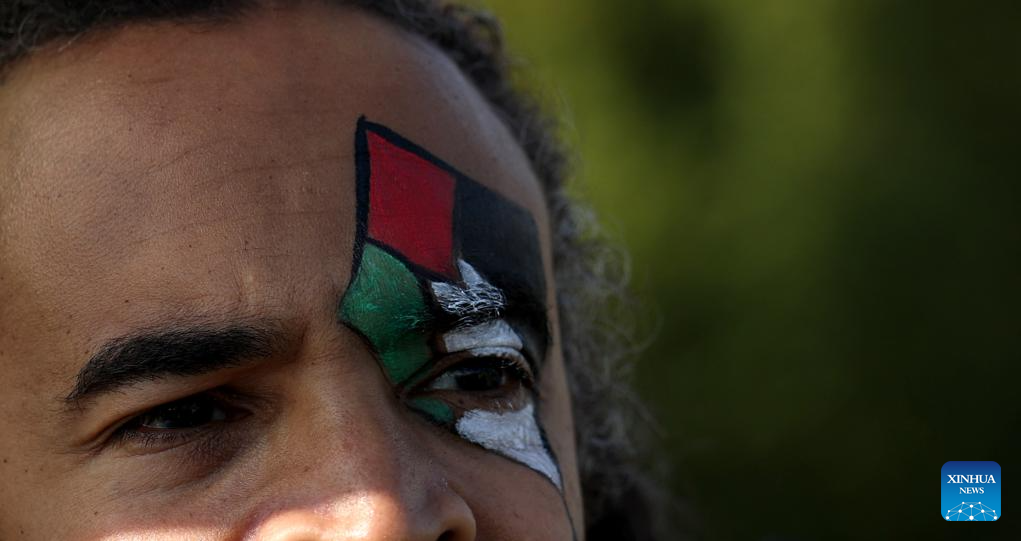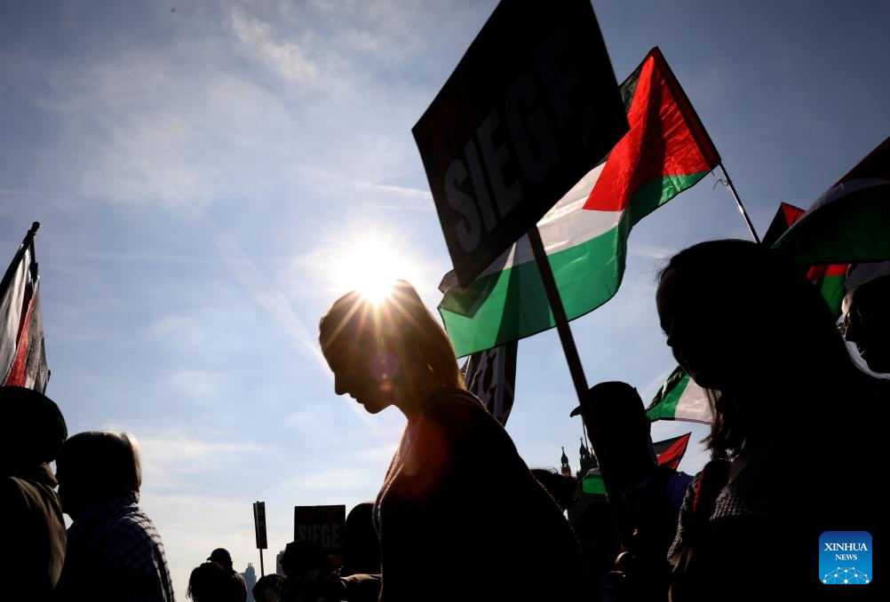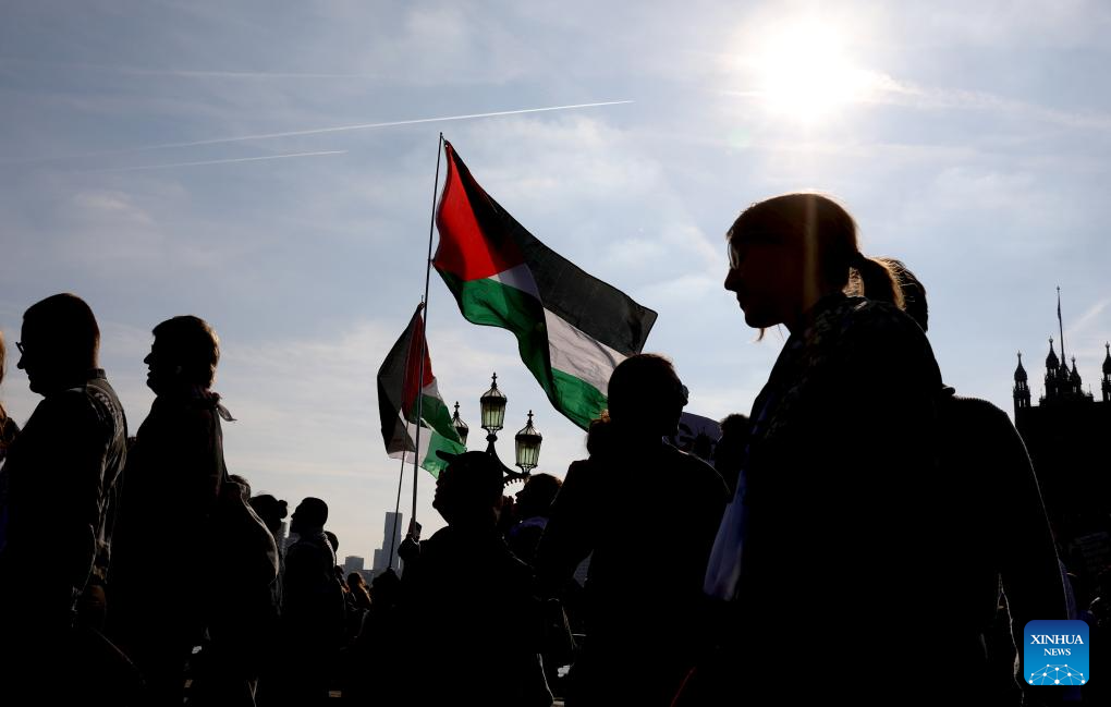 Protesters in support of Palestine are pictured in London, Britain, Oct. 11, 2025. Tens of thousands people took to the street here on Saturday in support of Palestine. (Xinhua/Li Ying)
