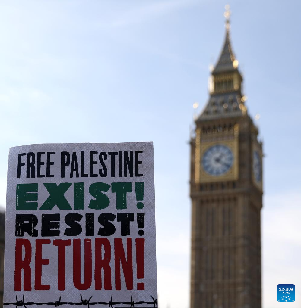 A placard held by a protester is pictured near the Big Ben in London, Britain, Oct. 11, 2025. Tens of thousands of people took to the street here on Saturday in support of Palestine. (Xinhua/Li Ying)