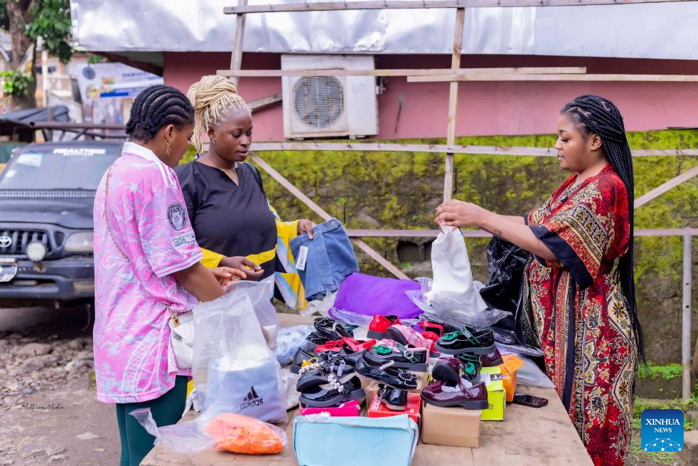 Elove Marie-Cleophas Messanga (R) displays clothes and shoes sourced from Chinese online platforms to people on a street in Buea, the chief town of the Southwest Region, Cameroon, on Sept. 20, 2025. (Photo by Muleng Timngum/Xinhua)