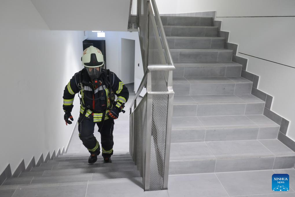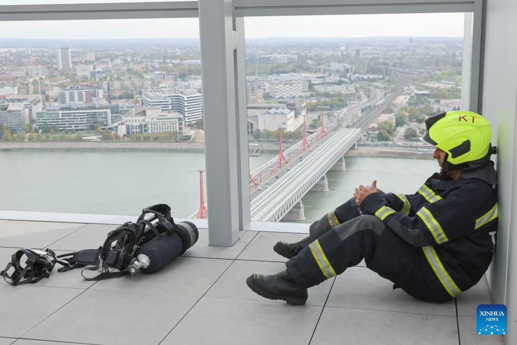A participant competes during the firemen stair running championship in Budapest, Hungary, on Oct. 11, 2025. (Photo by Attila Volgyi/Xinhua)