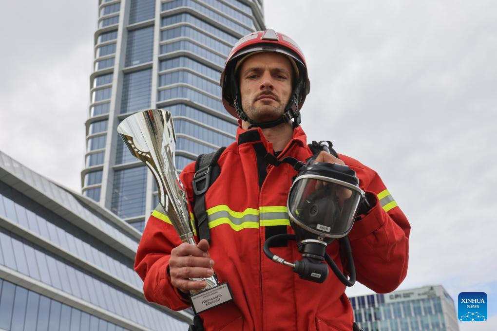 David Windischmann poses with his national champion trophy after defending his title in the firemen stair running championship in Budapest, Hungary, on Oct. 11, 2025. (Photo by Attila Volgyi/Xinhua)