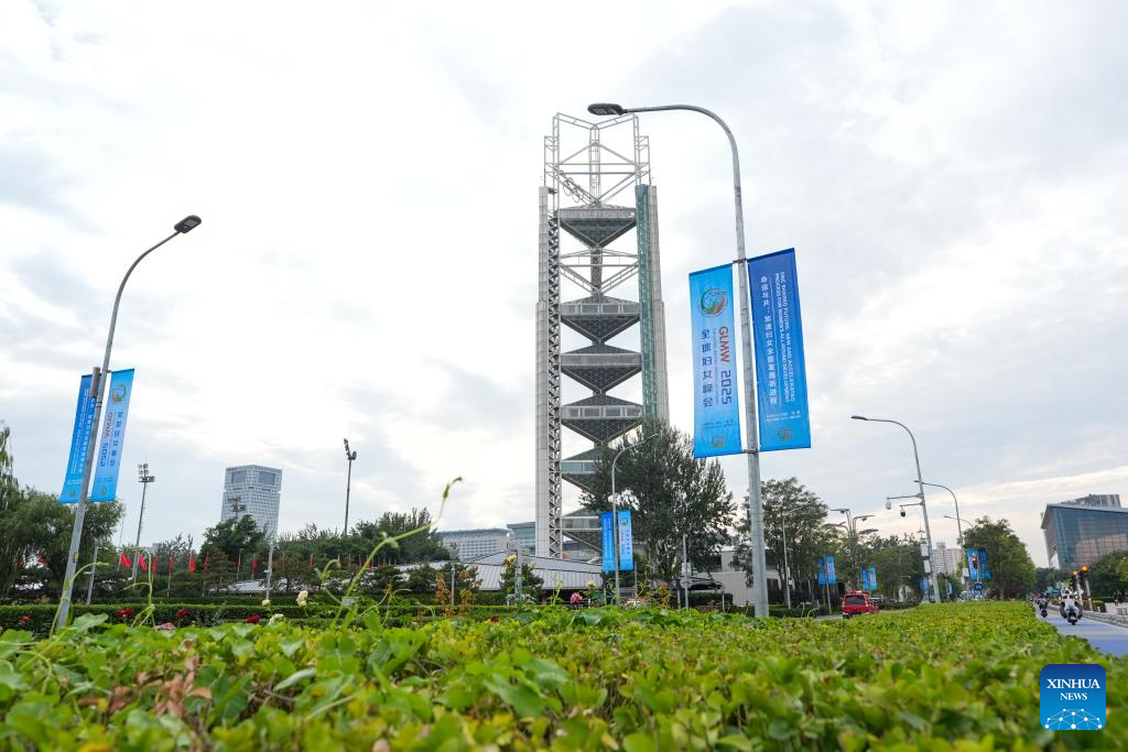 Street banners for the Global Leaders' Meeting on Women are pictured in Beijing, capital of China, on Oct. 11, 2025. The Global Leaders' Meeting on Women will be held in Beijing from Oct. 13 to 14. (Xinhua/Ju Huanzong)