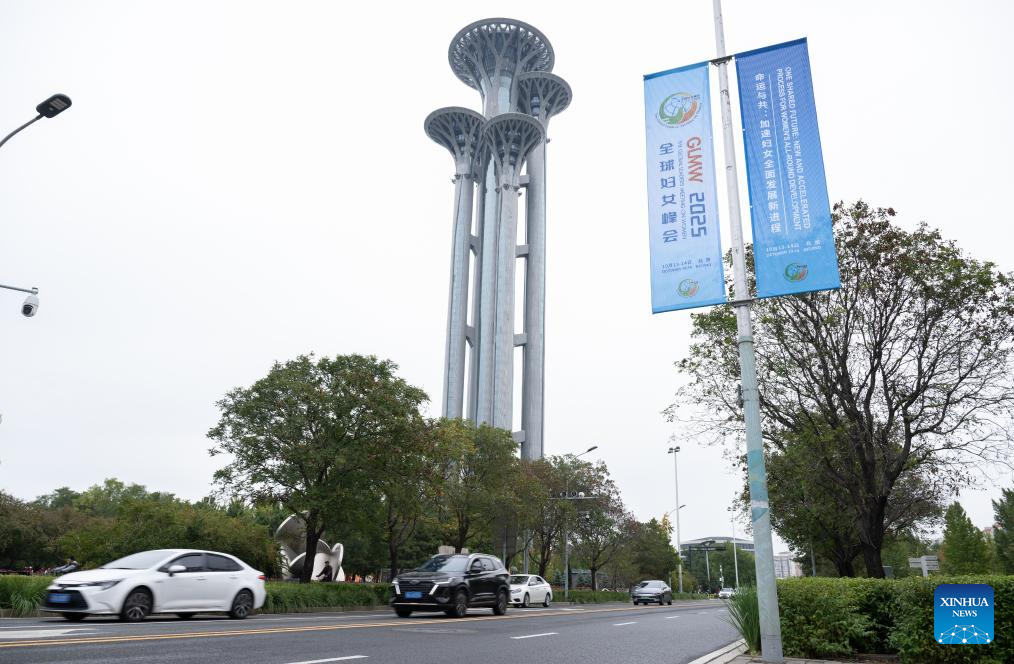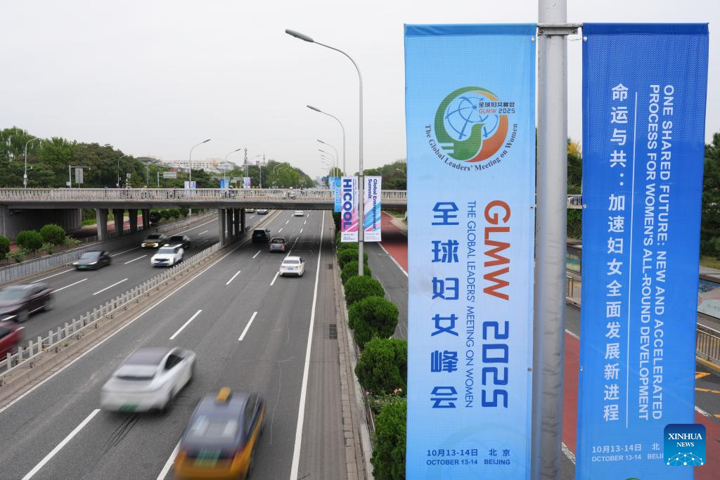 Street banners for the Global Leaders' Meeting on Women are pictured in Beijing, capital of China, on Oct. 12, 2025. The Global Leaders' Meeting on Women will be held in Beijing from Oct. 13 to 14. (Xinhua/Yan Linyun)