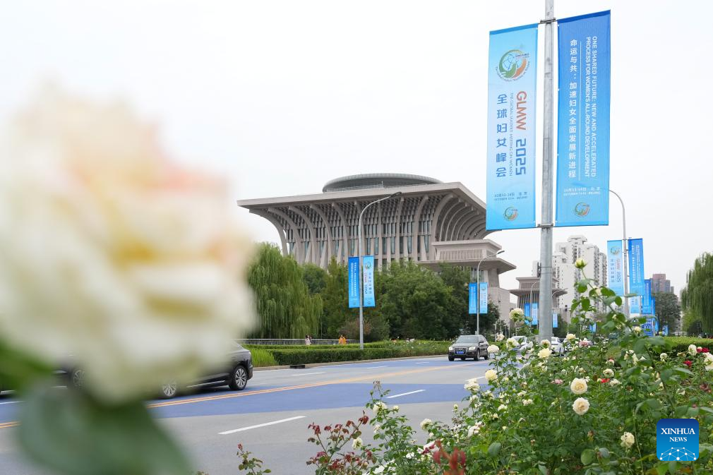 Street banners for the Global Leaders' Meeting on Women are pictured in Beijing, capital of China, on Oct. 12, 2025. The Global Leaders' Meeting on Women will be held in Beijing from Oct. 13 to 14. (Xinhua/Du Zixuan)