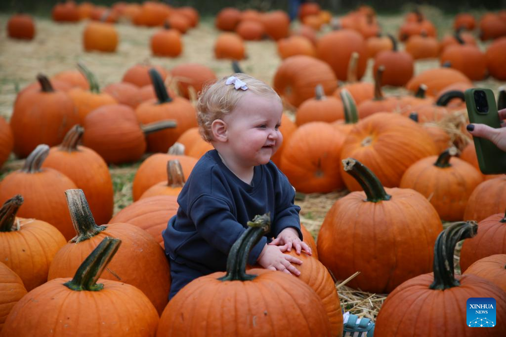 People visit a pumpkin patch at Queens County Farm Museum in New York, the United States, on Oct. 11, 2025. The pumpkin patch hosted by Queens County Farm Museum attracts many visitors to celebrate autumn and prepare for upcoming Halloween. (Xinhua/Zhang Fengguo)