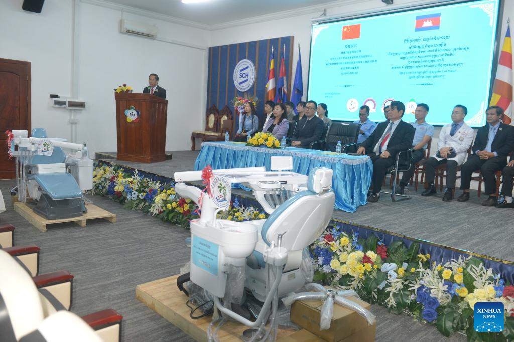 Cambodian and Chinese officials attend a hand-over ceremony of dental treatment chairs in Phnom Penh, Cambodia, Oct. 13, 2025. (Photo by Phearum/Xinhua)