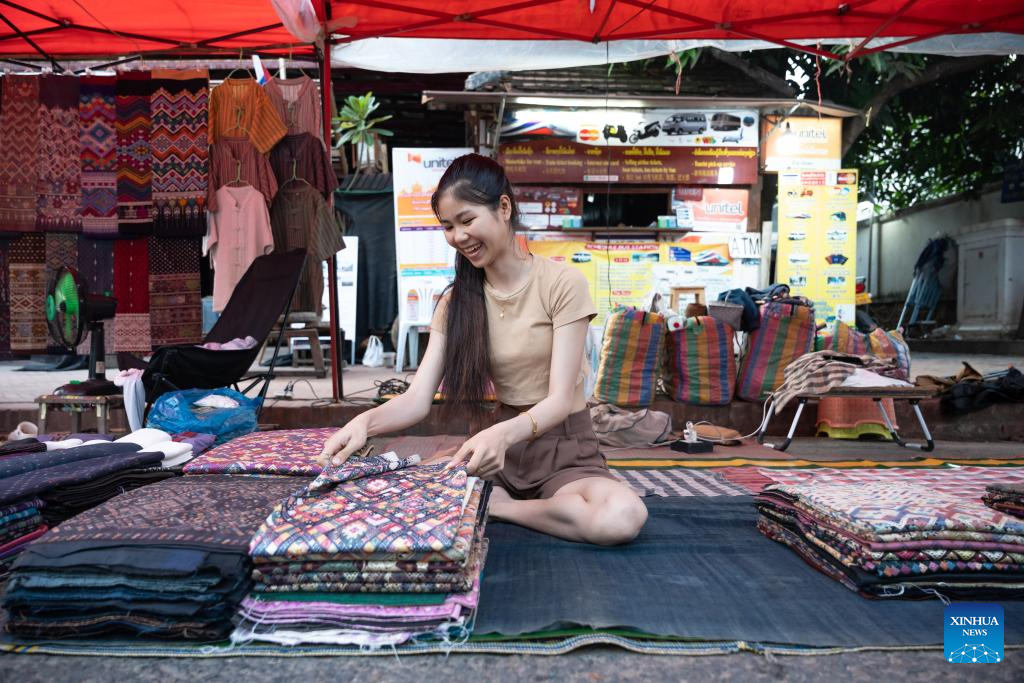 A woman arranges goods at a night market in Luang Prabang, Laos, Oct. 10, 2025. According to the World Bank statistics, the female population in Laos accounted for 49.8 percent of the country's total population in 2024. (Photo by Kaikeo Saiyasane/Xinhua)