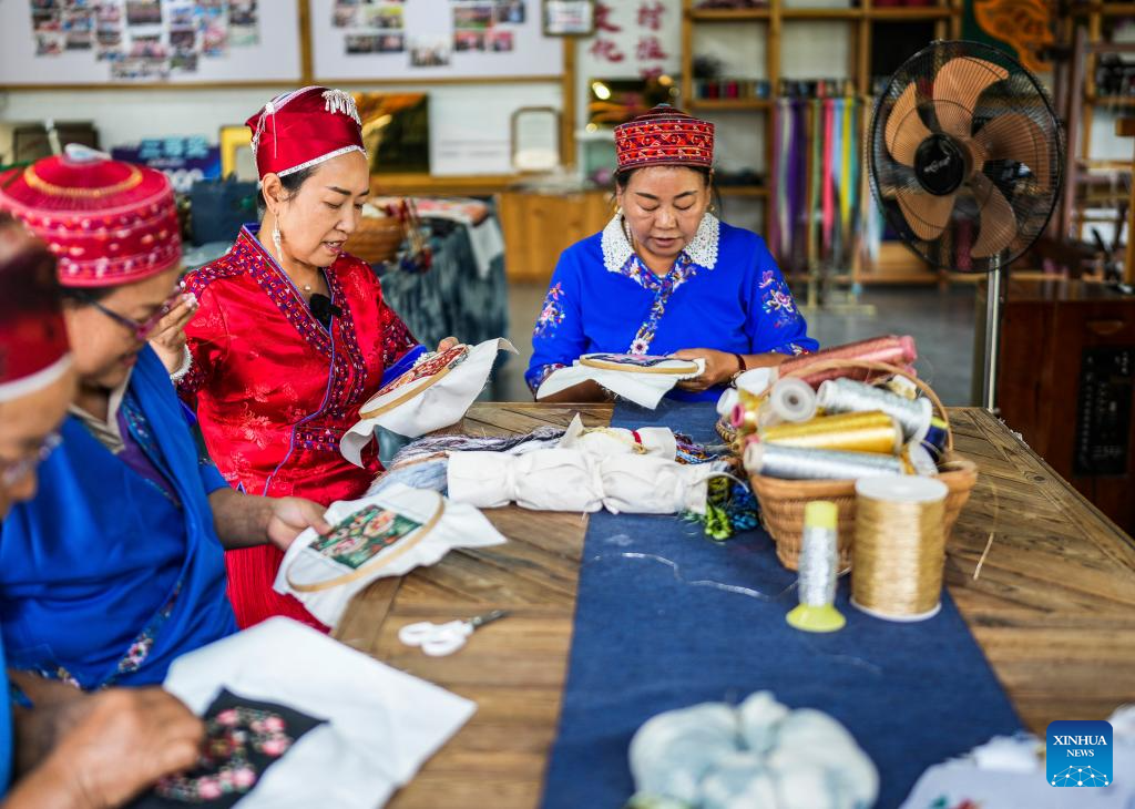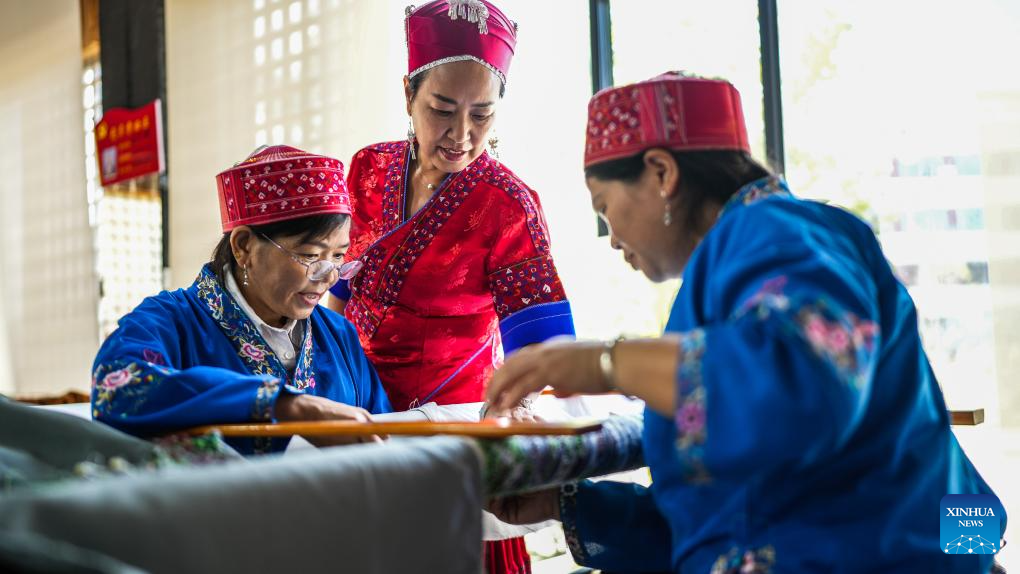 Long Luying (C) makes embroidery at the workshop in Shibing County of Qiandongnan Miao and Dong Autonomous Prefecture, southwest China's Guizhou Province, Oct. 10, 2025.