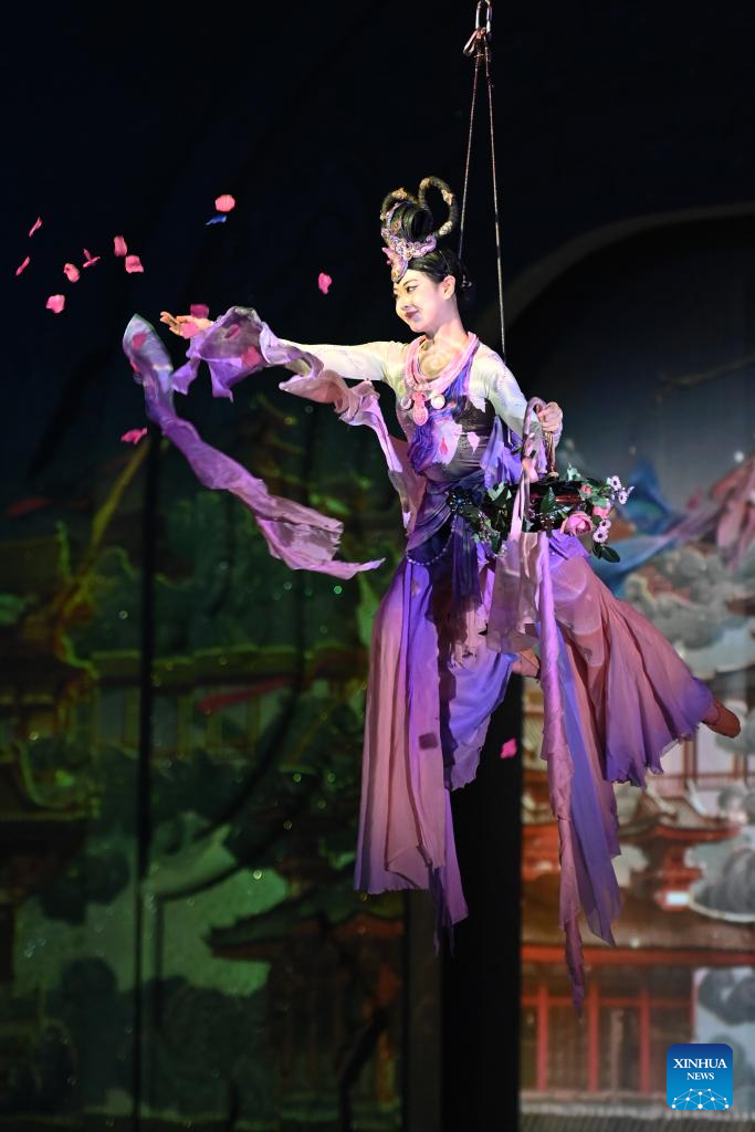 An immersive drama titled "Ancient Sound of Dunhuang" is staged for guests attending the Global Mayors Dialogue -- Dunhuang event, in Dunhuang, northwest China's Gansu Province, Oct. 12, 2025. (Xinhua/Fan Peishen)