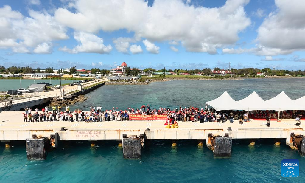 This photo taken on Oct. 13, 2025 shows the welcome ceremony for the Chinese naval hospital ship, Silk Road Ark, at Nuku'alofa Port in Tonga. The Chinese naval hospital ship, Silk Road Ark, arrived at Nuku'alofa Port, Tonga, on Monday, starting a seven-day visit featuring medical services and cultural activities during its Mission Harmony 2025. (Photo by Wang Junchuan/Xinhua)