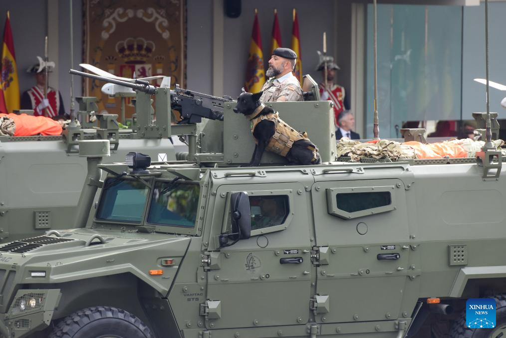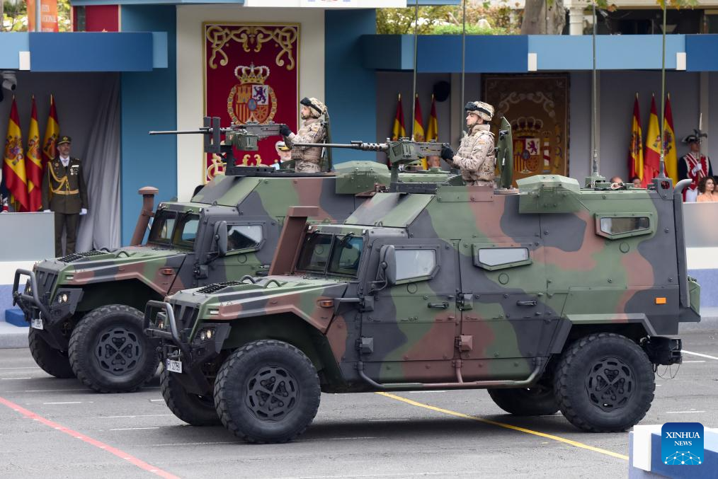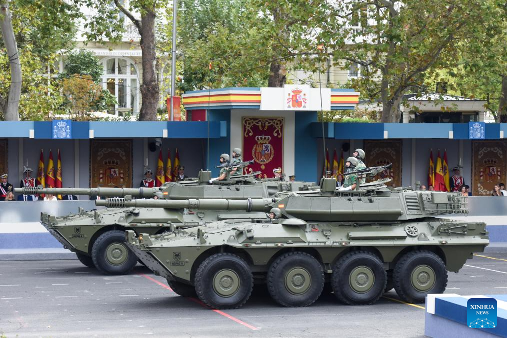 Military vehicles are seen during a military parade commemorating the National Day in Madrid, Spain, Oct. 12, 2025. (Photo by Gustavo Valiente/Xinhua)
