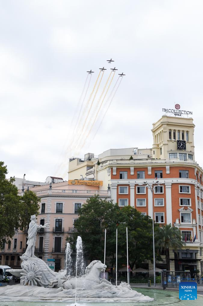 Aircraft perform during a military parade commemorating the National Day in Madrid, Spain, Oct. 12, 2025. (Photo by Gustavo Valiente/Xinhua)