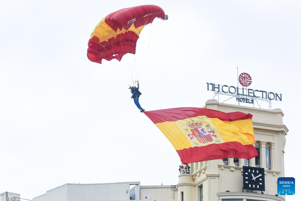 A paratrooper displays the national flag during a military parade commemorating the National Day in Madrid, Spain, Oct. 12, 2025. (Photo by Gustavo Valiente/Xinhua)