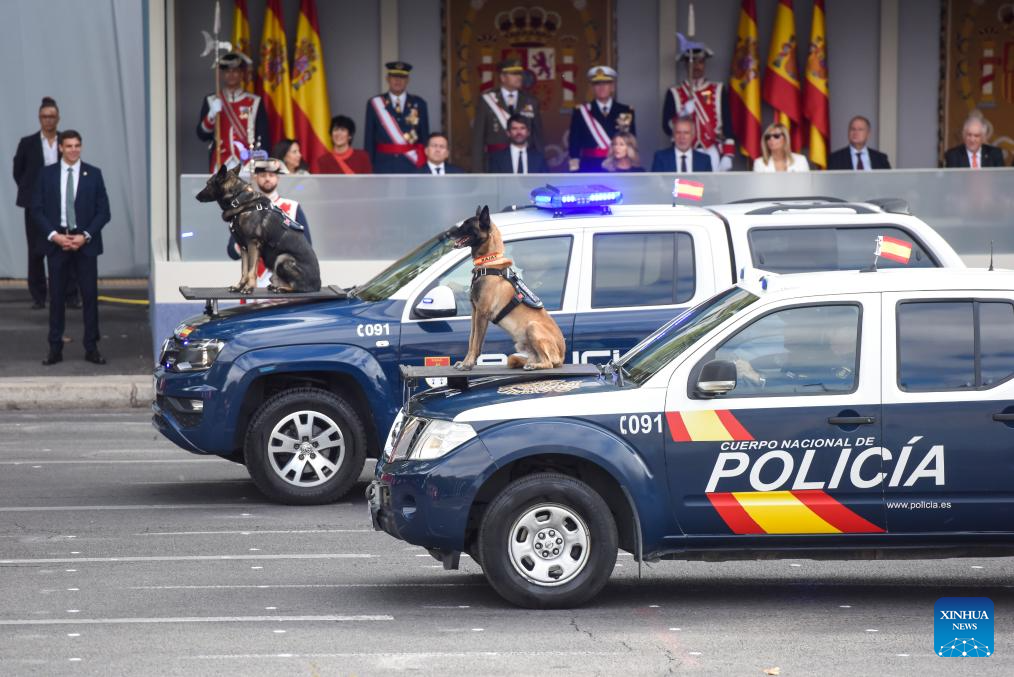 Police vehicles are seen during a military parade commemorating the National Day in Madrid, Spain, Oct. 12, 2025. (Photo by Gustavo Valiente/Xinhua)