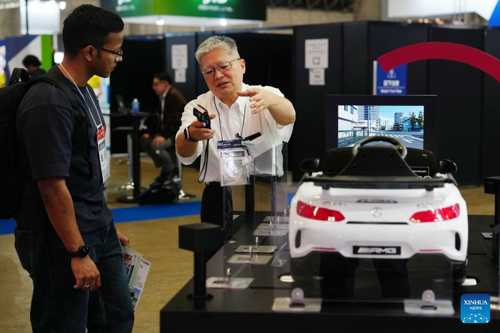 A staff member introduces intelligent driving technologies to a participant at the Combined Exhibition of Advanced Technologies (CEATEC) 2025 in Chiba Prefecture, Japan, on Oct. 14, 2025. The CEATEC 2025 kicked off here on Tuesday. (Xinhua/Jia Haocheng)