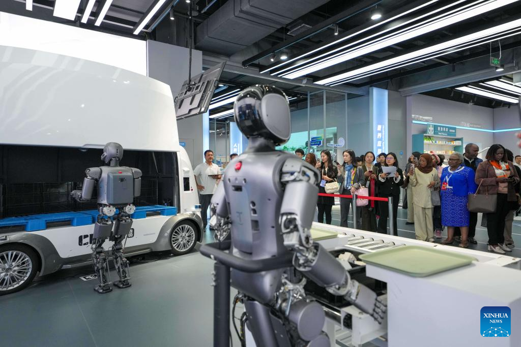 Representatives, who are in Beijing for the Global Leaders' Meeting on Women, learn about a humanoid robot at the Beijing World of Robots in Beijing, capital of China, Oct. 14, 2025. (Xinhua/Du Zixuan)