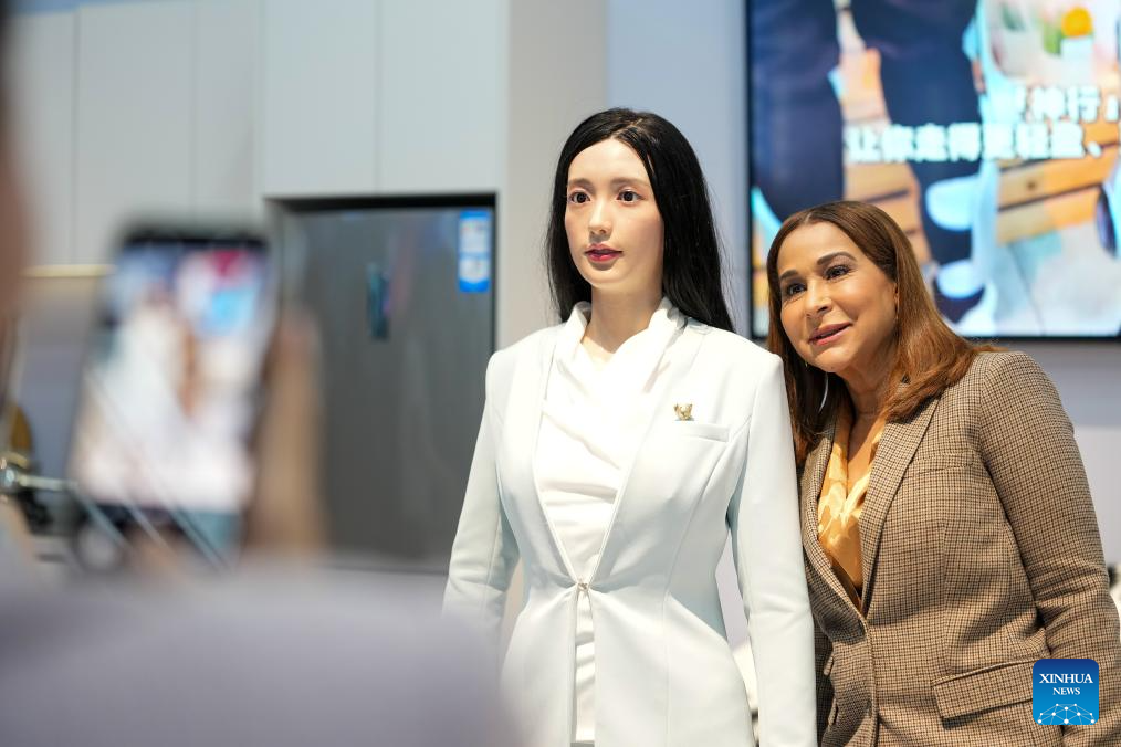 A representative, who is in Beijing for the Global Leaders' Meeting on Women, poses for photos with a humanoid robot at the Beijing World of Robots in Beijing, capital of China, Oct. 14, 2025. (Xinhua/Xue Yuge)