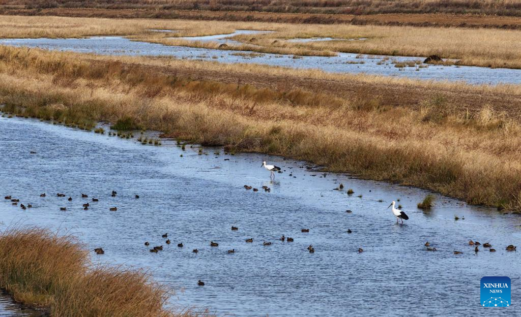 An aerial drone photo taken on Oct. 14, 2025 shows oriental white storks and wild ducks in Sanjiangkou national wetland park in Tongjiang City, northeast China's Heilongjiang Province. Migratory birds are about to fly south in the migratory season in Heilongjiang Province. (Photo by Liu Wanping/Xinhua)