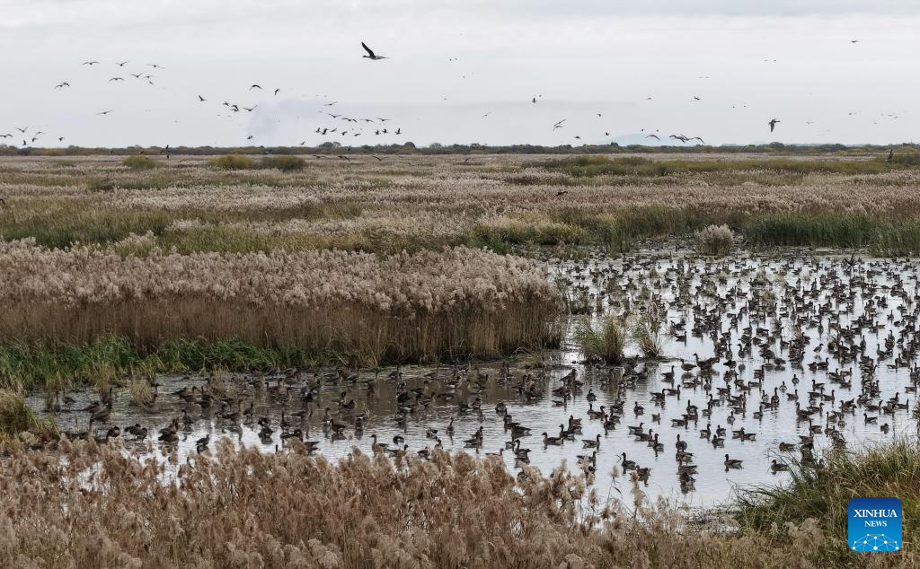 An aerial drone photo taken on Oct. 13, 2025 shows migratory birds foraging in a wetland of a national natural reserve in Mishan City, northeast China's Heilongjiang Province. Migratory birds are about to fly south in the migratory season in Heilongjiang Province. (Photo by Sun Haiqi/Xinhua)