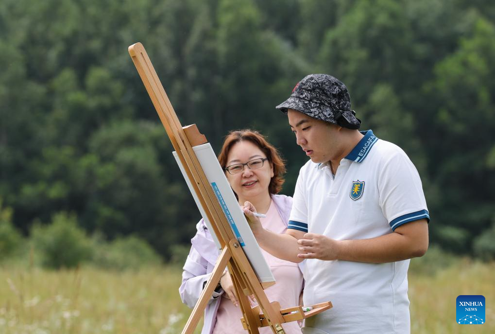 Wang Jianshu (R) paints in nature with his mother on a grassland in Chengde City, north China's Hebei Province, Aug. 18, 2025.(Xinhua/Lu Ye)