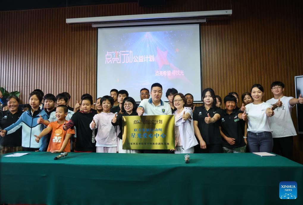 Wang Jianshu (front, 5th R) attends the cooperation ceremony between a public welfare activity and a Chengde sports training base, in Chengde City, north China's Hebei Province, Aug. 18, 2025.(Xinhua/Lu Ye)