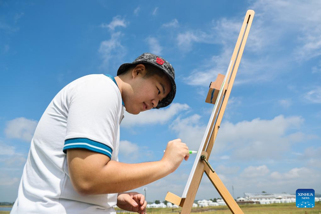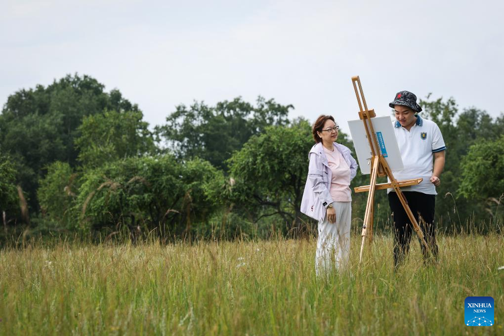 Wang Jianshu paints in nature on a grassland in Chengde City, north China's Hebei Province, Aug. 18, 2025.(Xinhua/Lu Ye)