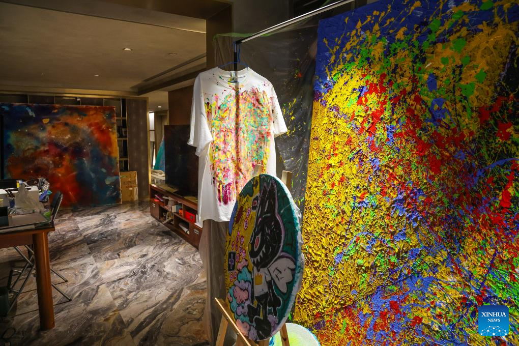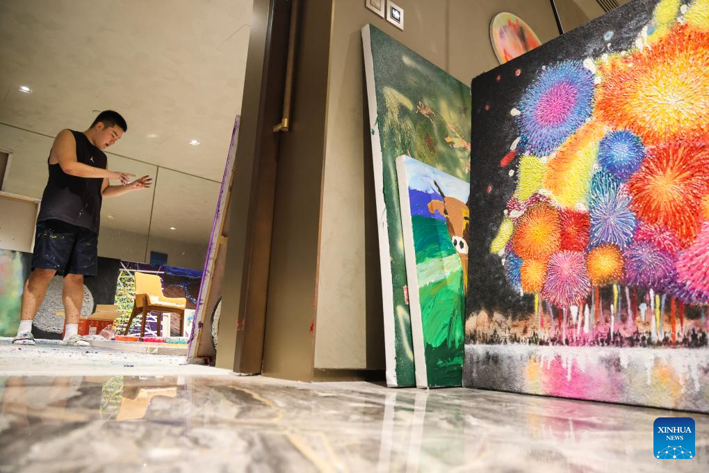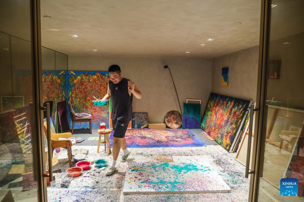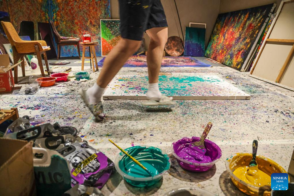 Wang Jianshu jumps for joy while creating a drip painting at his studio in Beijing, capital of China, Aug. 8, 2025.(Xinhua/Lu Ye)