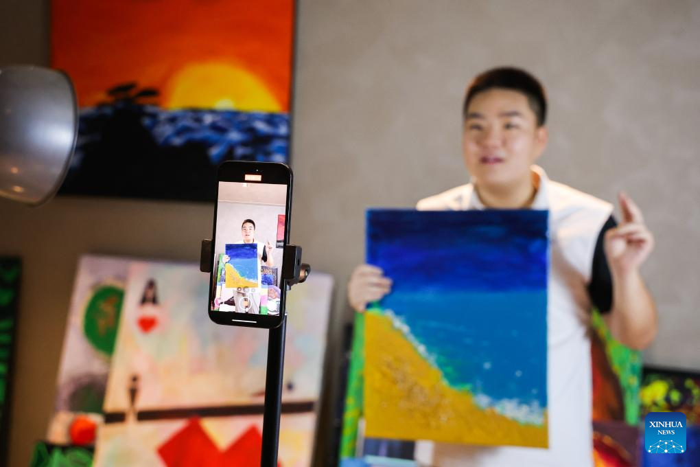 Wang Jianshu records a video to introduce his works to netizens at his studio in Beijing, capital of China, Aug. 8, 2025.(Xinhua/Lu Ye)