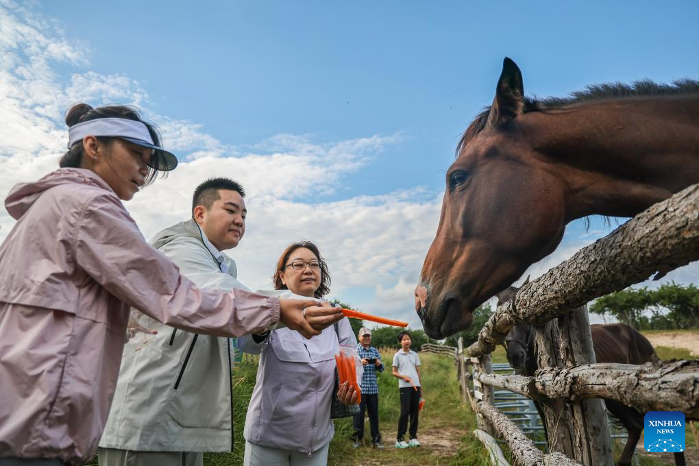 Wang Jianshu (2nd L) feeds animals on a grassland in Chengde City, north China's Hebei Province, Aug. 17, 2025.(Xinhua/Lu Ye)