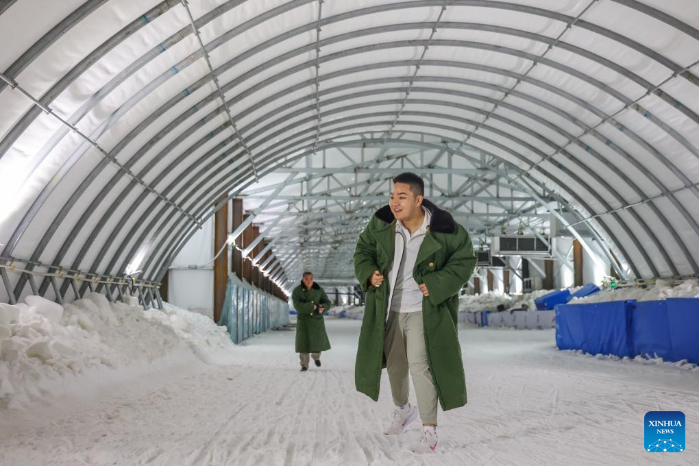Wang Jianshu experiences the ski slope at a snow sports training base in Chengde City, north China's Hebei Province, Aug. 17, 2025.(Xinhua/Lu Ye)