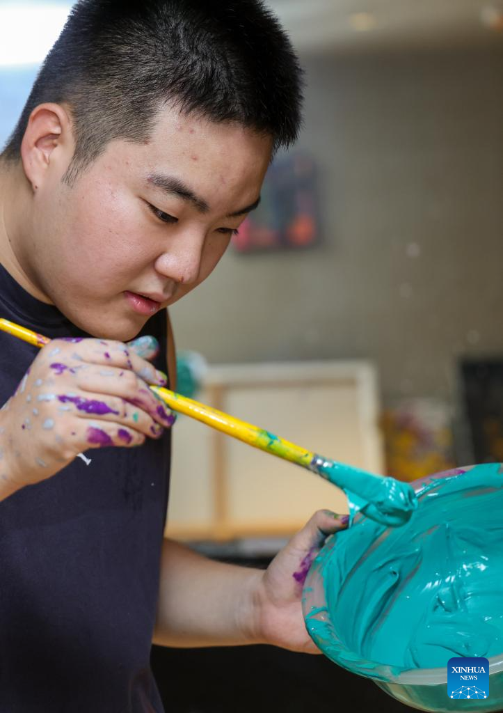 Wang Jianshu paints at his studio in Beijing, capital of China, Aug. 8, 2025.