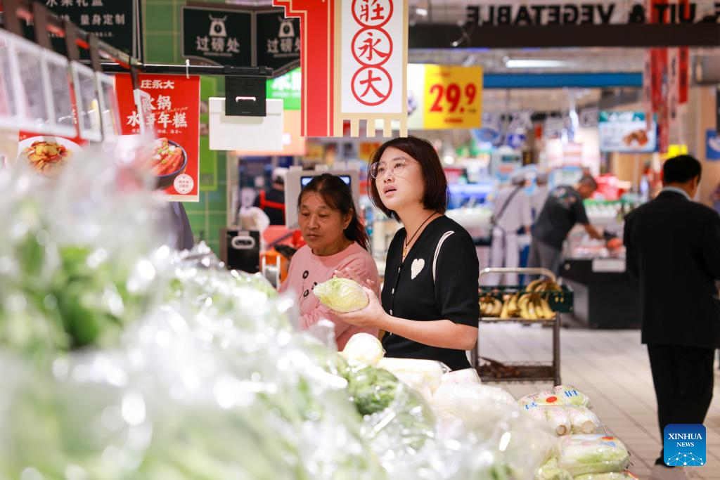 Customers select vegetable at a supermarket in Tangshan City, north China's Hebei Province, Oct. 15, 2025.(Photo by Liu Mancang/Xinhua)