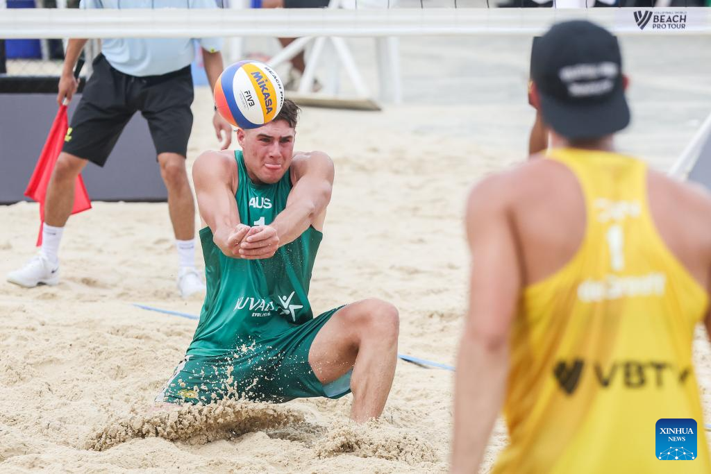 Logan Webber (R) of the United States competes against Luc Fluckiger of Switzerland during the men's qualification match between Hagen Smith/Logan Webber of the United States and Florian Breer/Luc Fluckiger of Switzerland at the Volleyball World Beach Pro Tour in Laguna Province, the Philippines, Oct. 15, 2025. (Xinhua/Rouelle Umali)