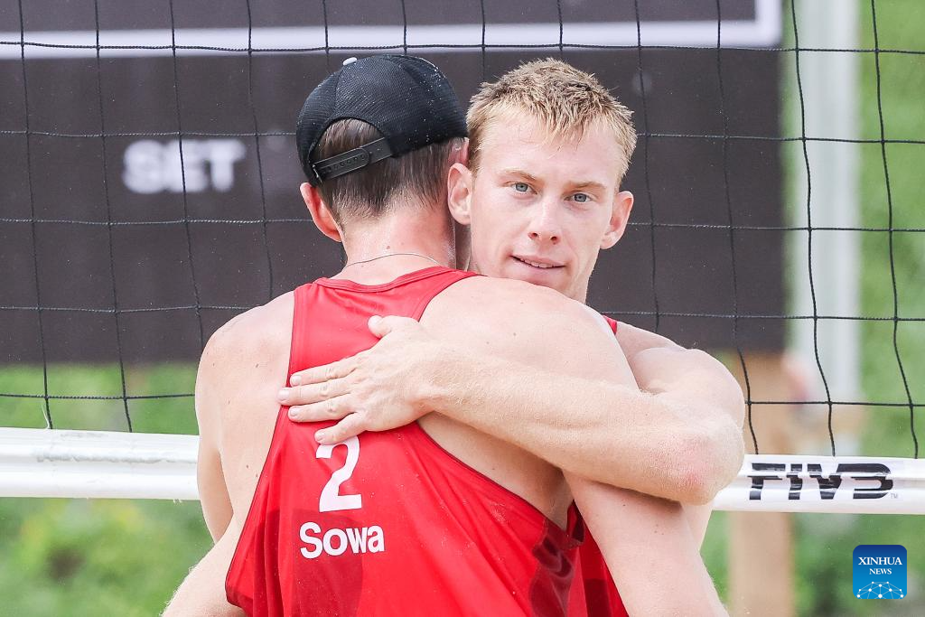 Jonas Reindhardt (back)/Robin Sowa of Germany celebrate winning the men's qualification match between Jonas Reindhardt/Robin Sowa of Germany and Nathan Matos/Pablo Perez Suarez of Spain at the Volleyball World Beach Pro Tour in Laguna Province, the Philippines, Oct. 15, 2025. (Xinhua/Rouelle Umali)