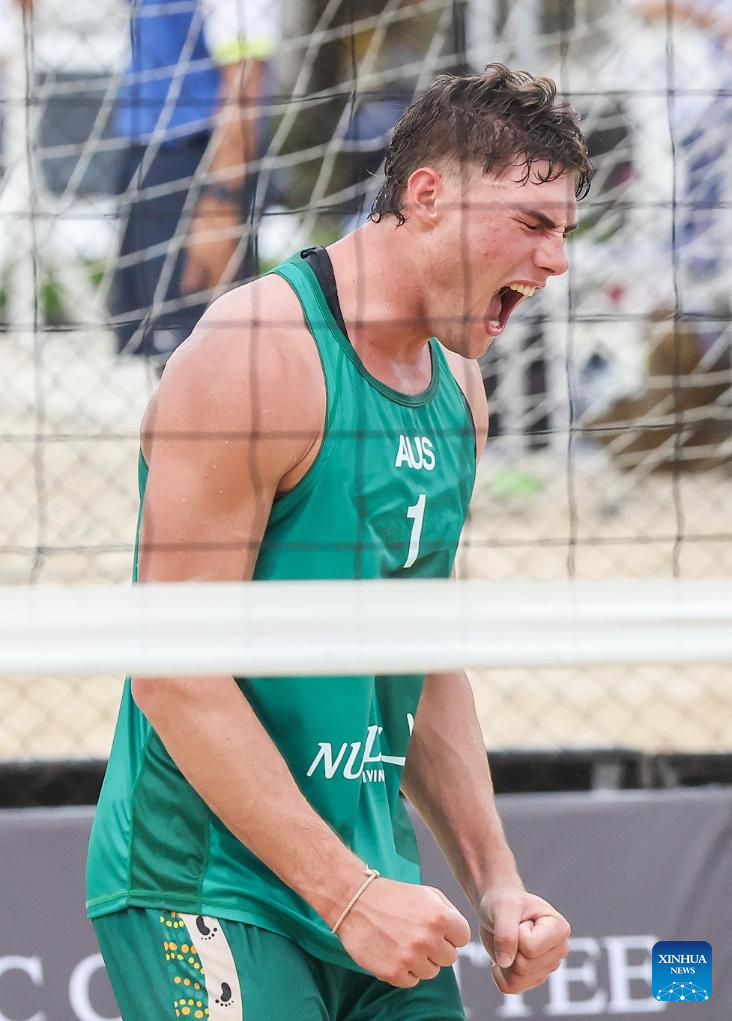 Ben Hood of Australia celebrates winning the men's qualification match between Ben Hood/Oliver Merritt of Australia and Luke de Greef/Martin Licht of Canada at the Volleyball World Beach Pro Tour in Laguna Province, the Philippines, Oct. 15, 2025. (Xinhua/Rouelle Umali)