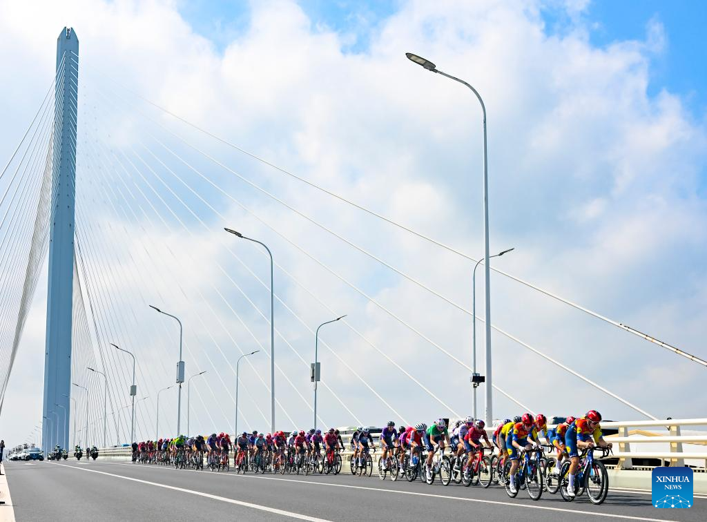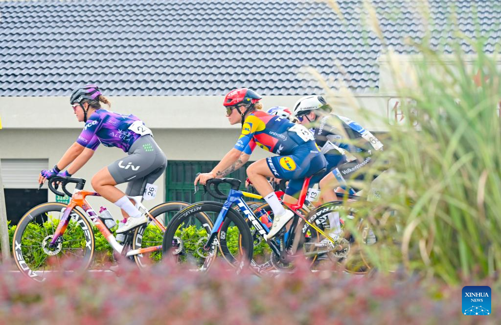 Cyclists compete during the Stage 2 of the UCI Women's WorldTour Tour of Chongming Island road cycling race in Shanghai, east China, Oct. 15, 2025. (Xinhua/Chen Haoming)