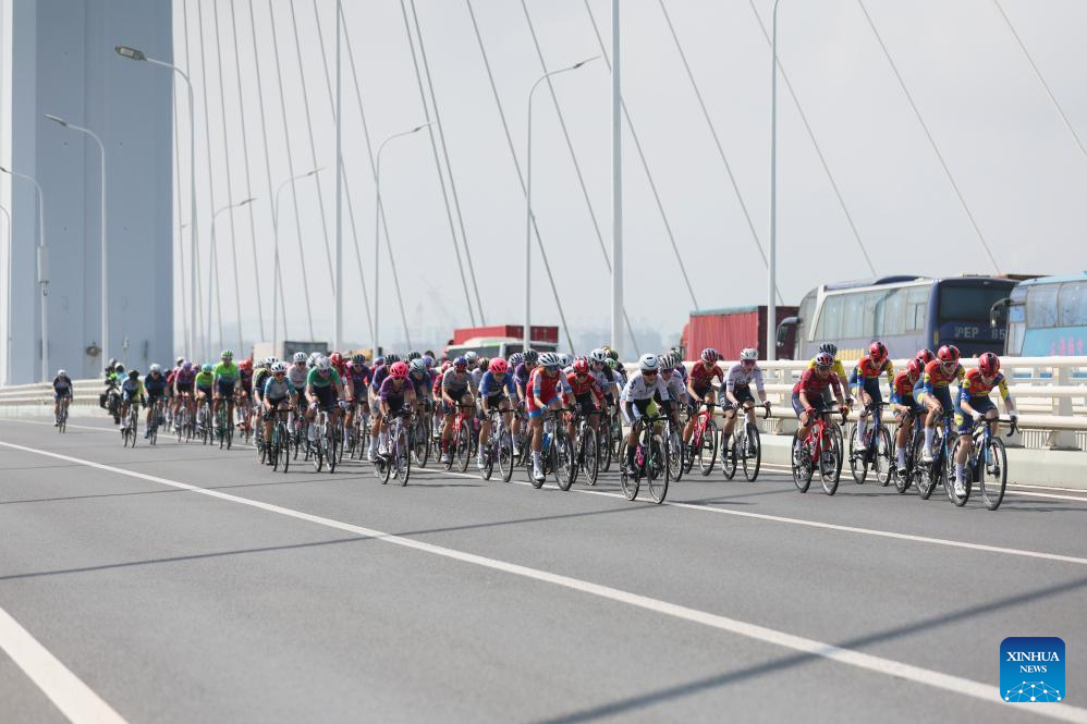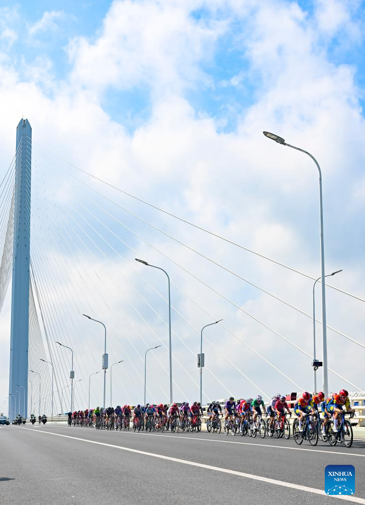 Cyclists compete across the Shanghai Yangtze River Bridge during the Stage 2 of the UCI Women's WorldTour Tour of Chongming Island road cycling race in Shanghai, east China, Oct. 15, 2025. (Xinhua/Chen Haoming)
