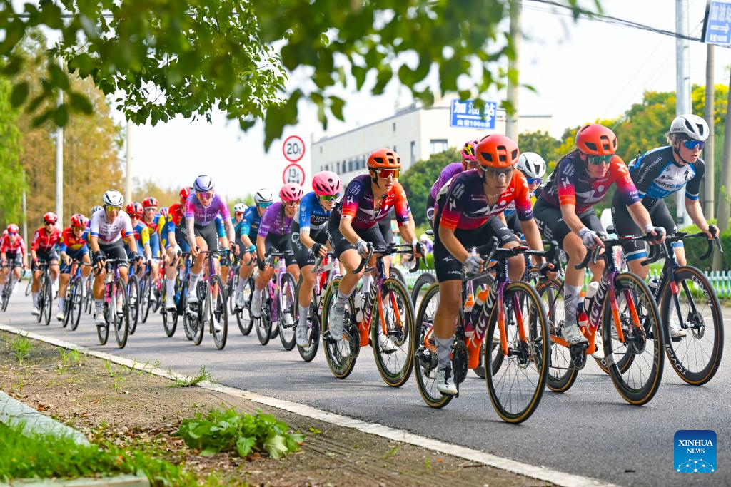 Cyclists compete during the Stage 2 of the UCI Women's WorldTour Tour of Chongming Island road cycling race in Shanghai, east China, Oct. 15, 2025. (Xinhua/Wang Xiang)