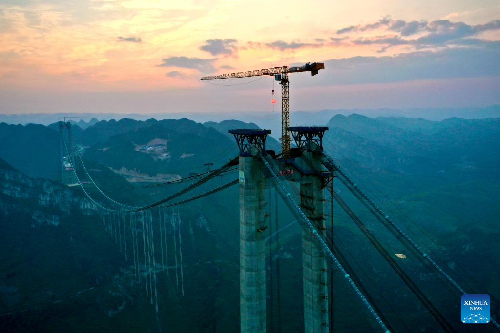This photo taken in October 2024 by Xie Chaoqing, a local guesthouse owner, shows the Huajiang Grand Canyon Bridge under construction in southwest China's Guizhou Province. (Photo by Xie Chaoqing/Xinhua)