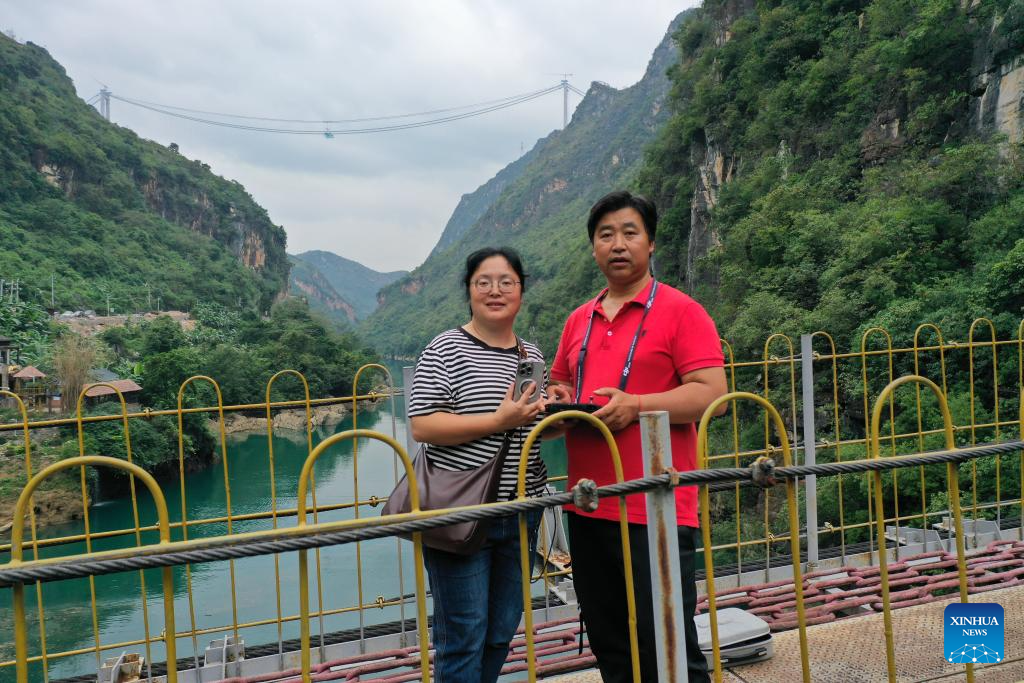 GUIYANG, Oct. 15 (Xinhua) -- As the Huajiang Grand Canyon Bridge in southwest China's Guizhou Province stood veiled in morning mist, Xie Chaoqing, a local guesthouse owner, flew his drone past its tallest tower, capturing anew the majestic stature of the world's highest operational bridge, a structure he said has completely transformed his life.