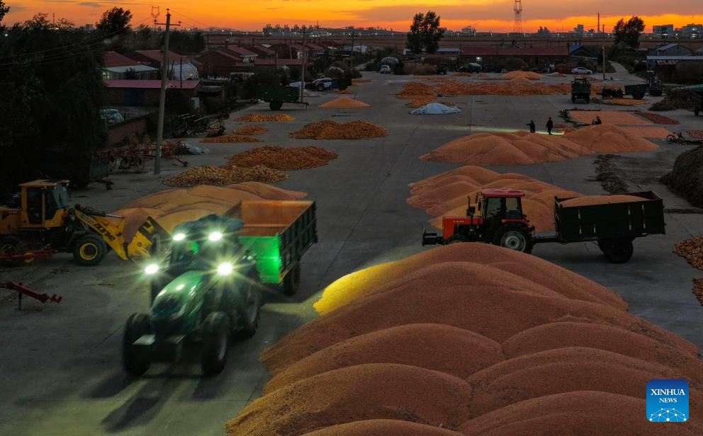 Farmers spread newly harvested corns to air in Suihua City, northeast China's Heilongjiang Province, Oct. 14, 2025. The autumn harvest in Heilongjiang, China's top grain producer, has been in full swing. As of Oct. 14, Heilongjiang had completed the harvesting of approximately 153.60 million mu (10.24 million hectares) of autumn grain crops, accounting for over 60 percent of the total. (Xinhua/Xie Jianfei)