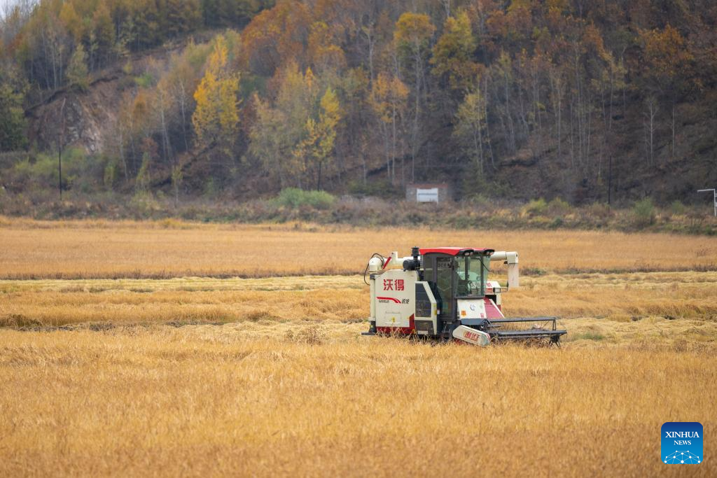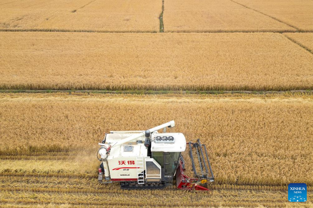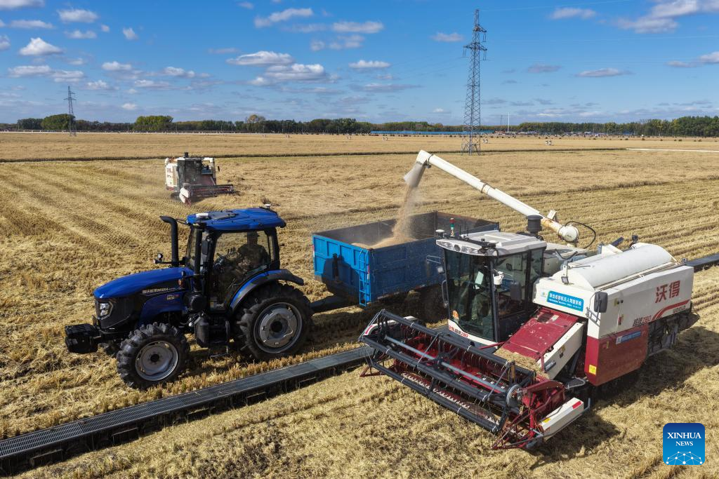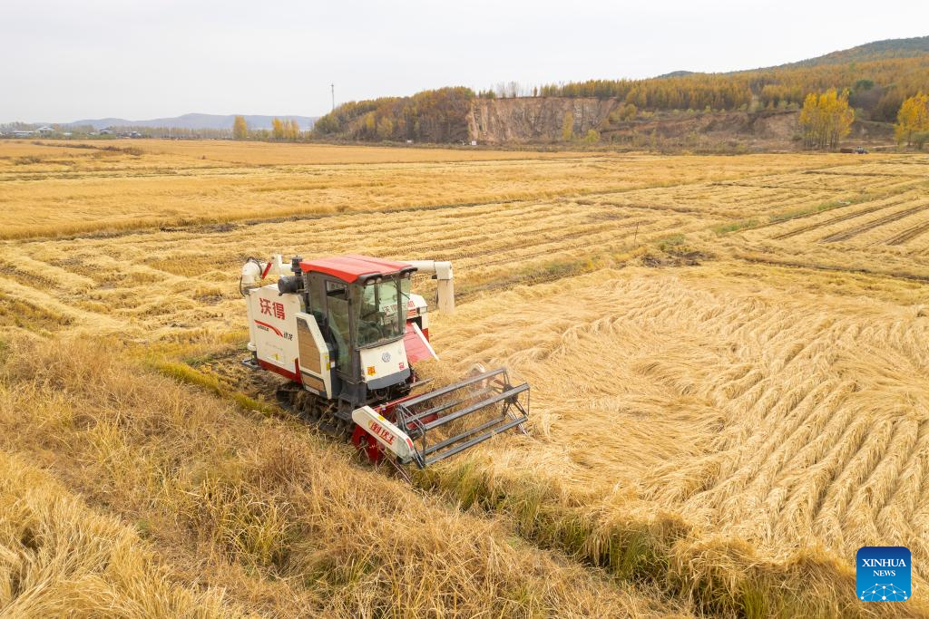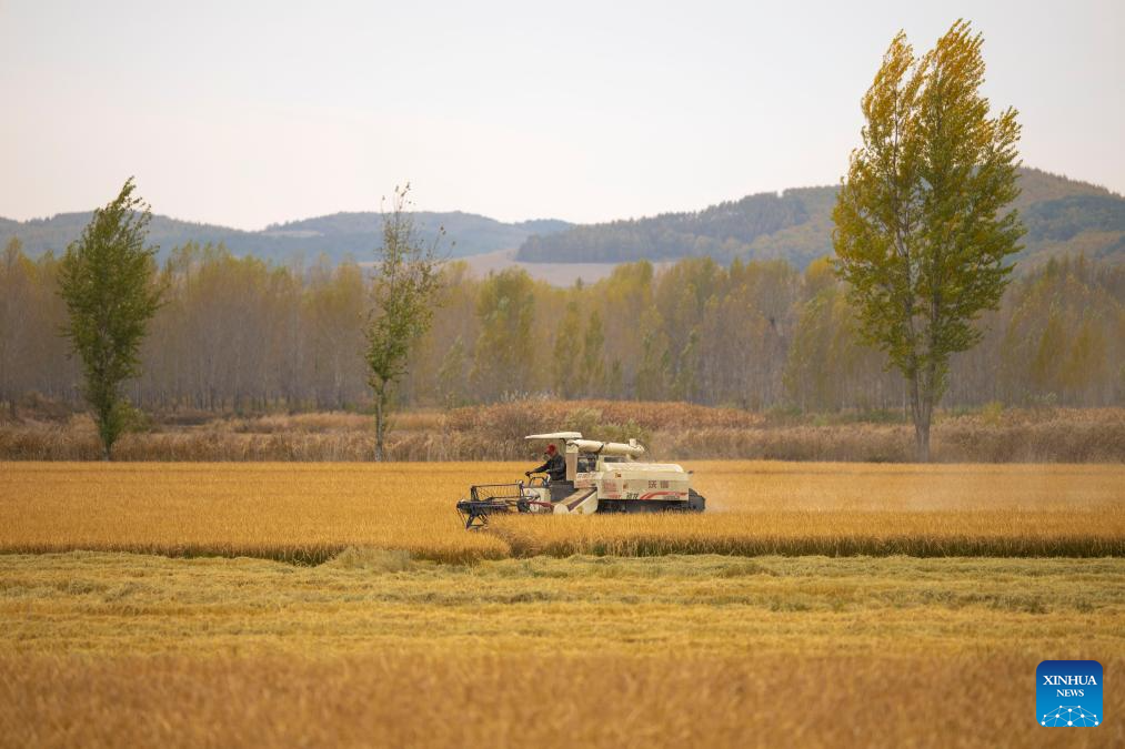 A farmer drives a reaper to harvest rice in Mudanjiang City, northeast China's Heilongjiang Province, Oct. 14, 2025. The autumn harvest in Heilongjiang, China's top grain producer, has been in full swing. As of Oct. 14, Heilongjiang had completed the harvesting of approximately 153.60 million mu (10.24 million hectares) of autumn grain crops, accounting for over 60 percent of the total. (Xinhua/Zhang Tao)